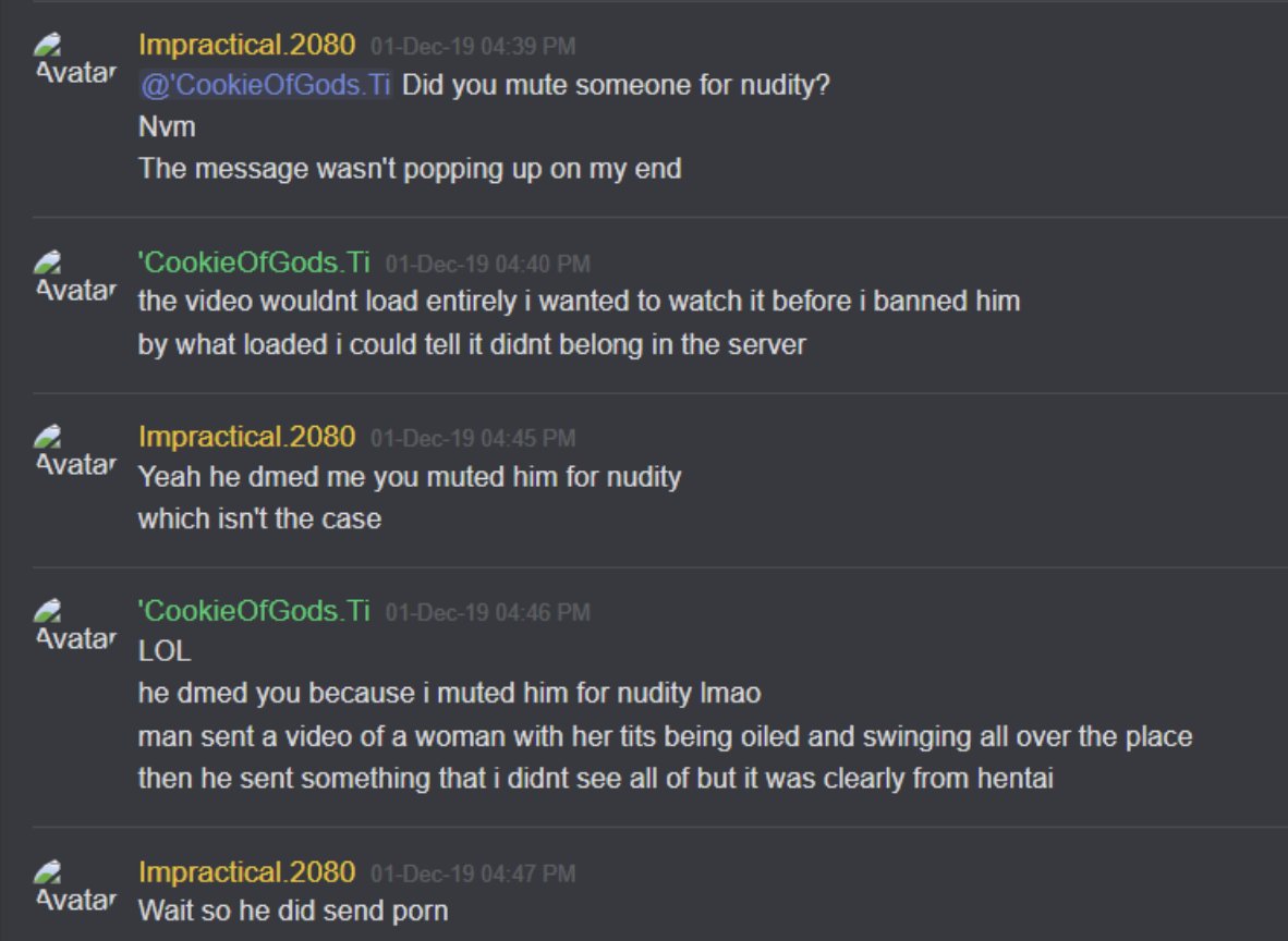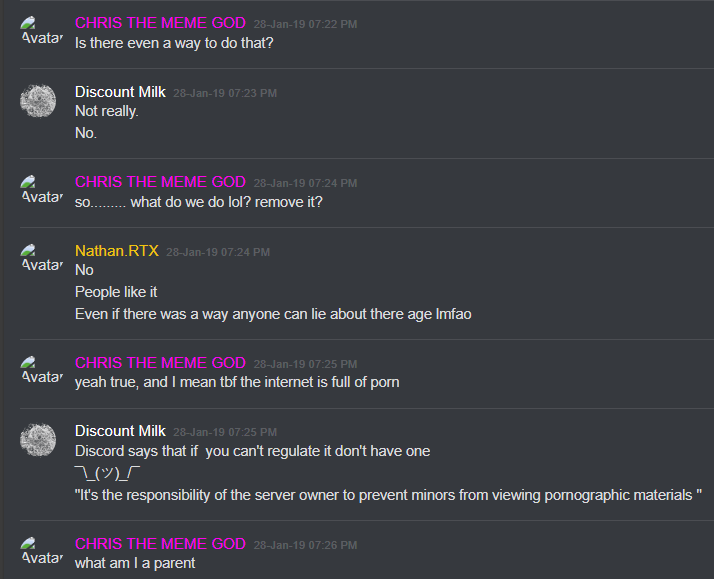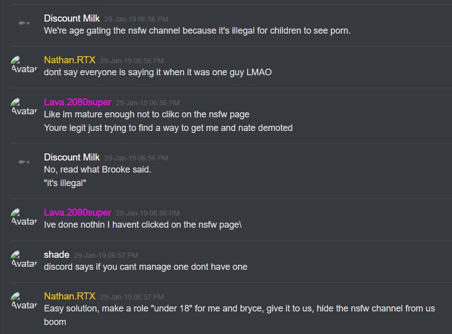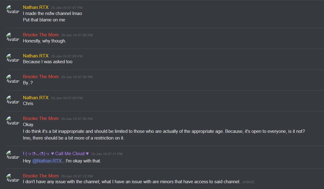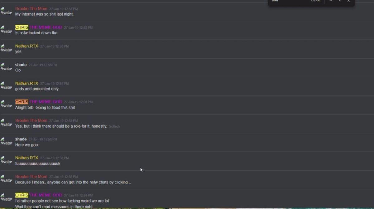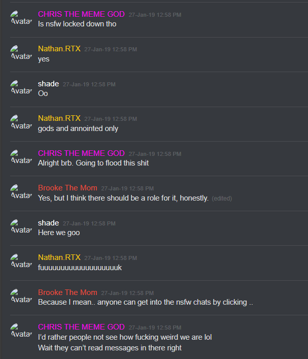 27-Jan-19 10:58 AM | 539157192029241365 | Chris_TheMemeGod#0420 (Chris The Meme God) [User ID: 218946035563757568]: Is nsfw locked down tho 27-Jan-19 10:58 AM | 539157200292151299 | StillNotNate#1337 (StillNotNate) [User ID: 189493530186612737]: yes 27-Jan-19 10:58 AM | 539157230407254019 | StillNotNate#1337 (StillNotNate) [User ID: 189493530186612737]: gods and annointed only 27-Jan-19 10:58 AM | 539157237659336715 | Chris_TheMemeGod#0420 (Chris The Meme God) [User ID: 218946035563757568]: Alright brb. Going to flood this shit 27-Jan-19 10:58 AM | 539157238011527169 | ItsMeBrooke#5430 (Brooke the Mom) [User ID: 186320713823551489]: Yes, but I think there should be a role for it, honestly. 27-Jan-19 10:58 AM | 539157299533578250 | ItsMeBrooke#5430 (Brooke the Mom) [User ID: 186320713823551489]: Because I mean.. anyone can get into the nsfw chats by clicking .. 27-Jan-19 10:58 AM | 539157328344121374 | Chris_TheMemeGod#0420 (Chris The Meme God) [User ID: 218946035563757568]: I’d rather people not see how fucking weird we are lol