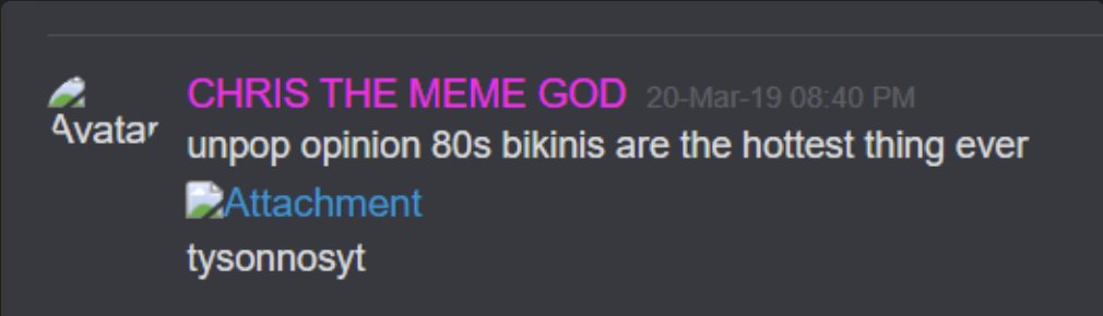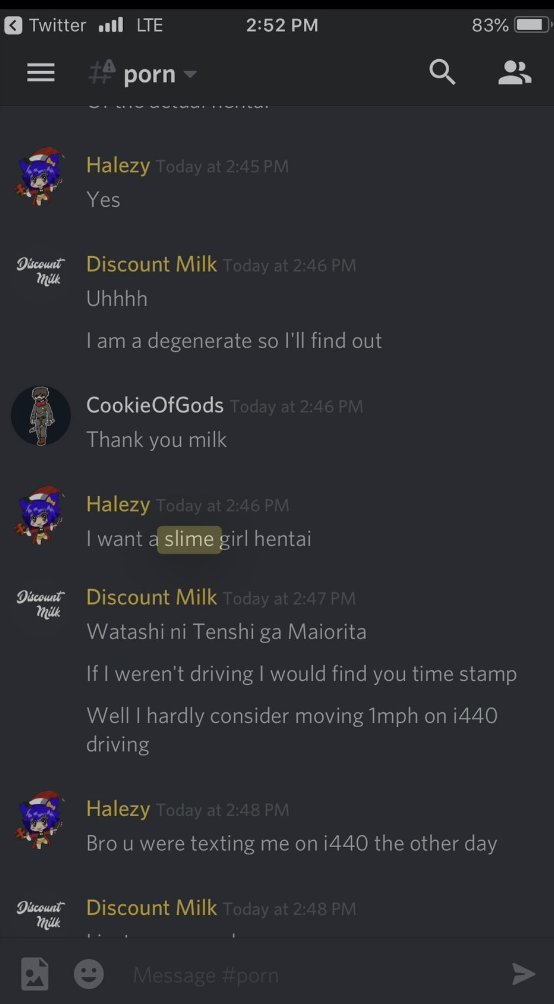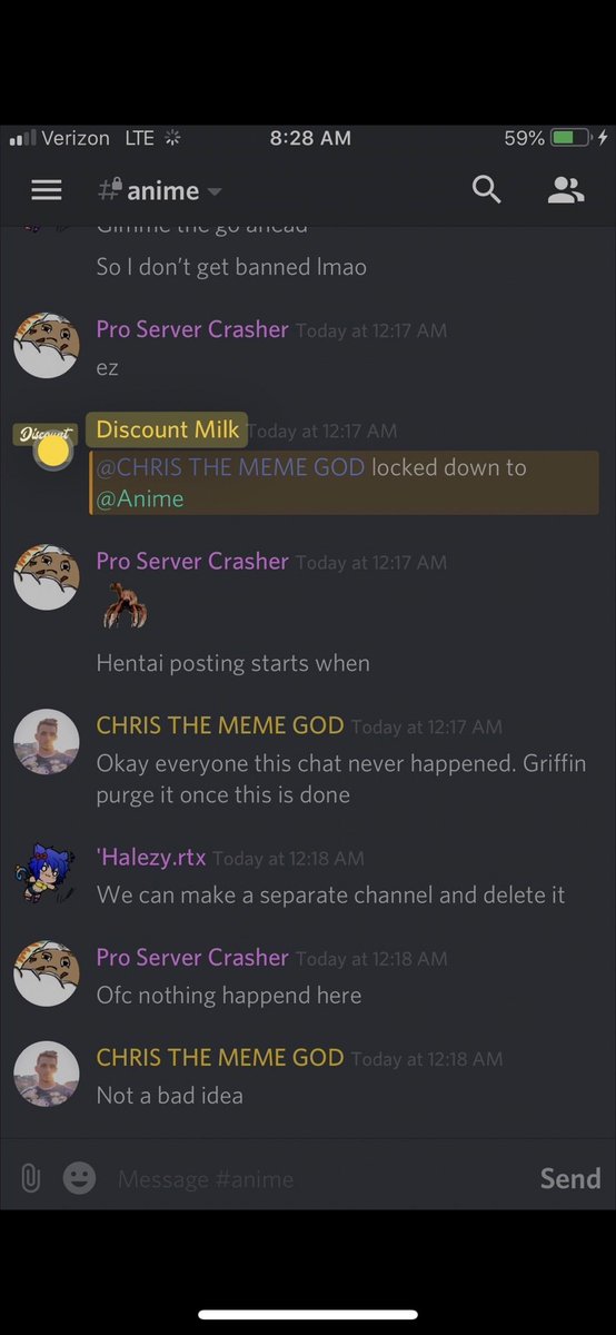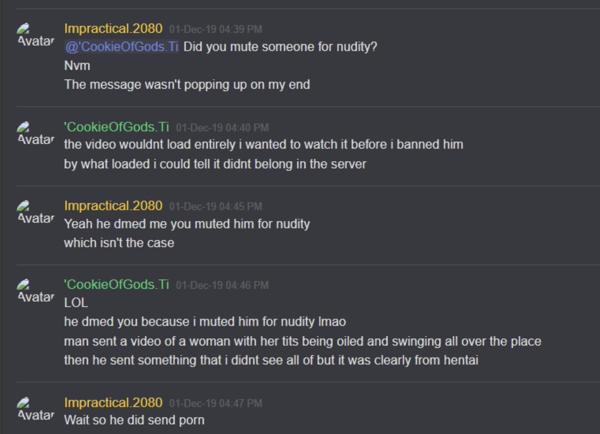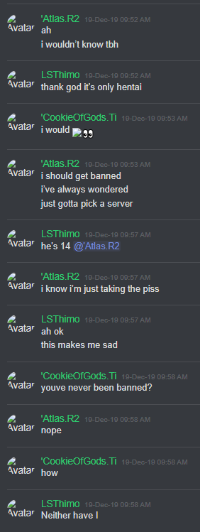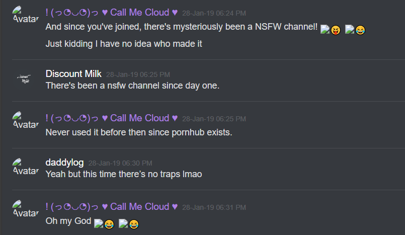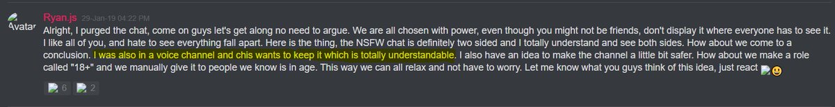 27-Jan-19 10:58 AM | 539157192029241365 | Chris_TheMemeGod#0420 (Chris The Meme God) [User ID: 218946035563757568]: Is nsfw locked down tho 27-Jan-19 10:58 AM | 539157200292151299 | StillNotNate#1337 (StillNotNate) [User ID: 189493530186612737]: yes 27-Jan-19 10:58 AM | 539157230407254019 | StillNotNate#1337 (StillNotNate) [User ID: 189493530186612737]: gods and annointed only 27-Jan-19 10:58 AM | 539157237659336715 | Chris_TheMemeGod#0420 (Chris The Meme God) [User ID: 218946035563757568]: Alright brb. Going to flood this shit 27-Jan-19 10:58 AM | 539157238011527169 | ItsMeBrooke#5430 (Brooke the Mom) [User ID: 186320713823551489]: Yes, but I think there should be a role for it, honestly. 27-Jan-19 10:58 AM | 539157299533578250 | ItsMeBrooke#5430 (Brooke the Mom) [User ID: 186320713823551489]: Because I mean.. anyone can get into the nsfw chats by clicking .. 27-Jan-19 10:58 AM | 539157328344121374 | Chris_TheMemeGod#0420 (Chris The Meme God) [User ID: 218946035563757568]: I’d rather people not see how fucking weird we are lol