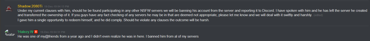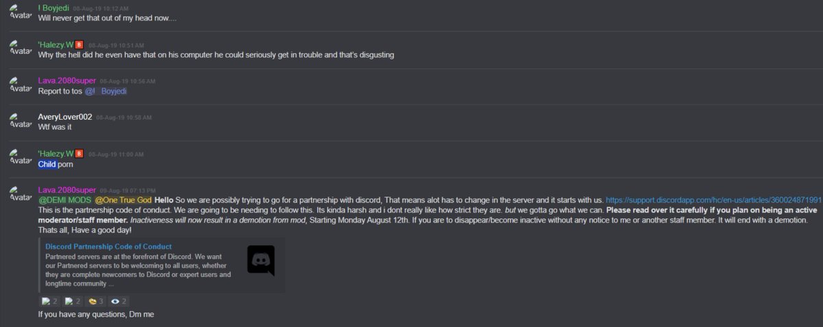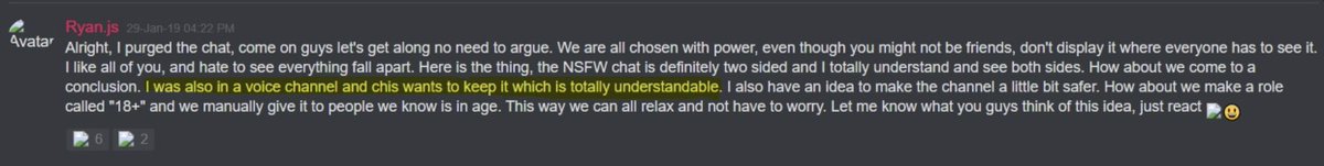 @KiwiFarmsDotNet Discussion in 2019 when the first alleged victim, Lava, was 13 at the time, where Chris discusses locking down the NSFW Discord server because he "would rather not have people see how f*cking weird we are."
