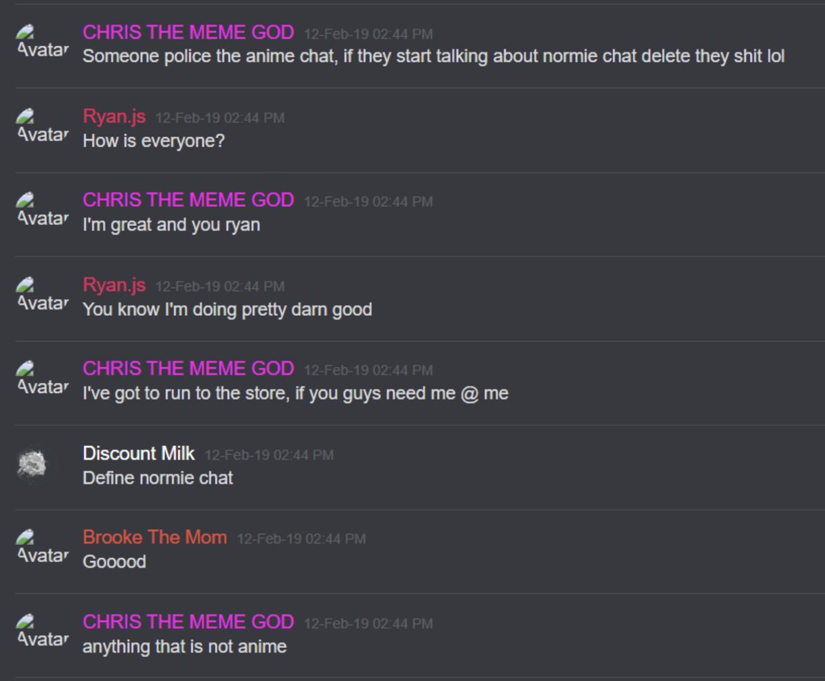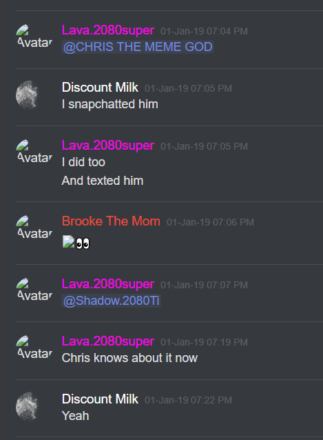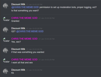 *Note: the Discord user "Discount Milk," who is mentioned all throughout the previous logs, was Chris' lab partner in community college when Chris was in school for his networking major*