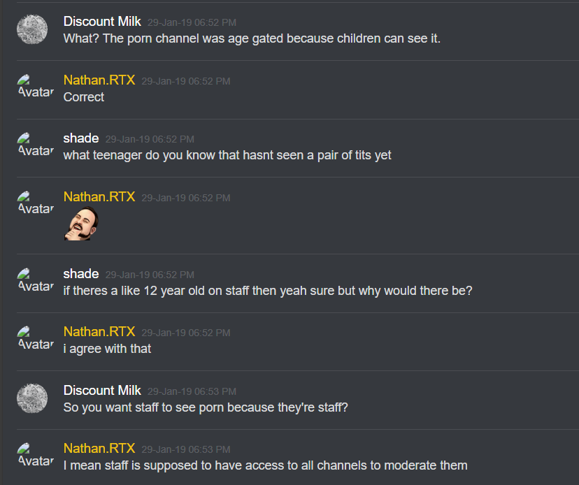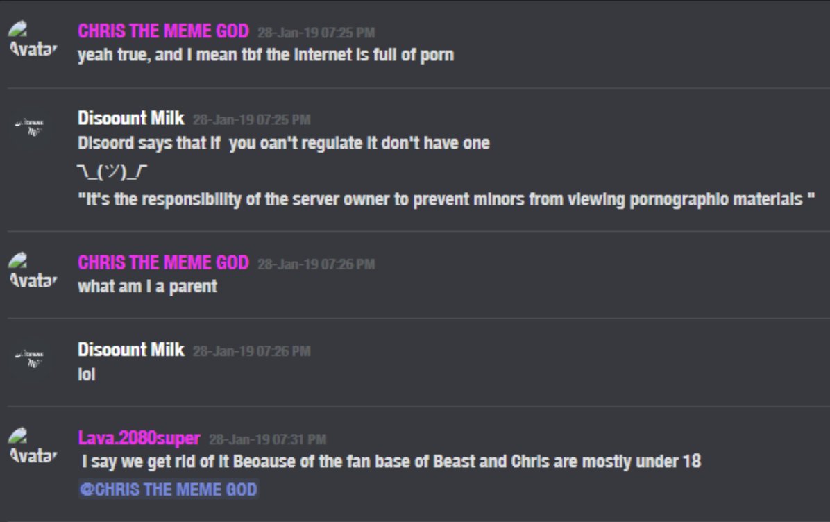 One of the alleged victims, Nathan W, claims to have retrieved the actual logs from Chris's server from before it was purged, including proof of a NSFW channel where Chris and other minors would hang out. Lava, the other alleged victim of Chris who tried to downplay the events to purportedly protect Chris and MrBeast, tried to deny this yesterday when only a couple of screencaps were available.