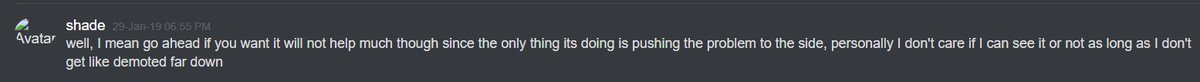 27-Jan-19 10:58 AM | 539157403648786442 | Chris_TheMemeGod#0420 (Chris The Meme God) [User ID: 218946035563757568]: Wait they can’t read messages in there right