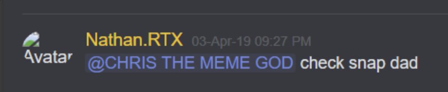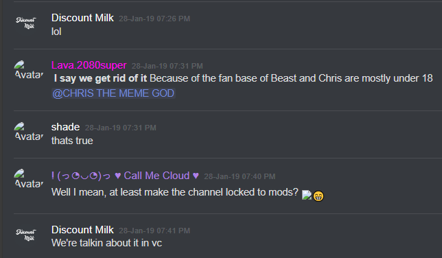 27-Jan-19 10:58 AM | 539157237659336715 | Chris_TheMemeGod#0420 (Chris The Meme God) [User ID: 218946035563757568]: Alright brb. Going to flood this shit