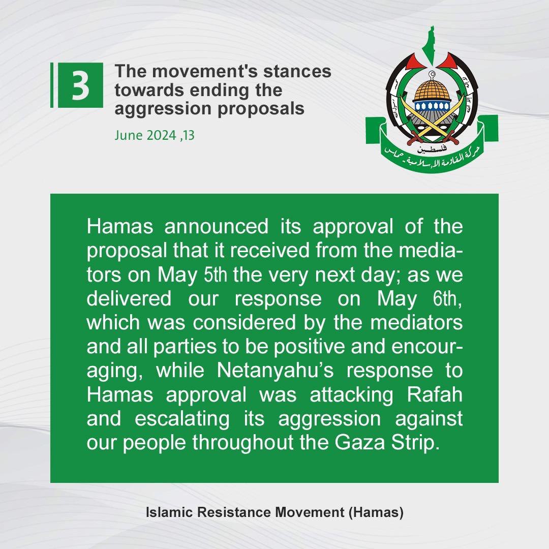 ⭕️ The Hamas movement has demonstrated, in all stages of negotiations to stop the aggression, the required positivity to reach a comprehensive and satisfactory agreement, based on the fair demands of our people for a definitive cessation of aggression, a complete withdrawal [of occupation forces] from the Gaza Strip, the return of the displaced, the reconstruction, and a serious prisoner exchange deal.