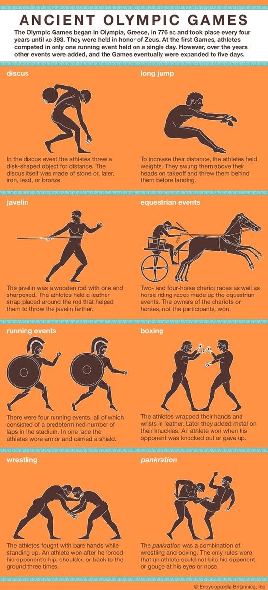 Some examples are Pentathlon, five-event competition including discus, javelin, long jump, stadion race, and wrestling, combat Sports like Boxing, wrestling, and pankration (Greek MMA) and chariot and horse racing.