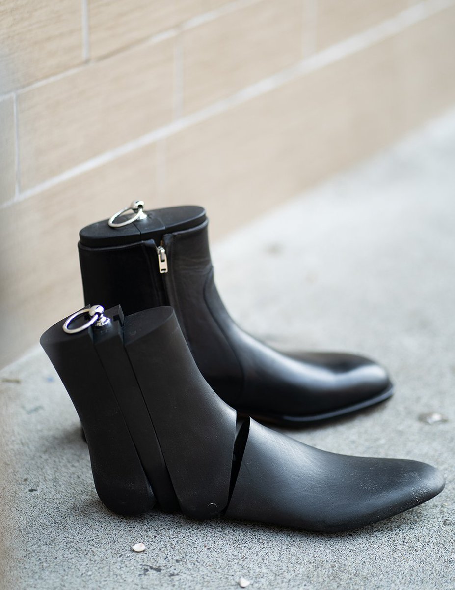 There are also three piece shoe trees, which are more common for bespoke boots. Here, you insert the front, then the back, and then slide the center piece so everything is secure.