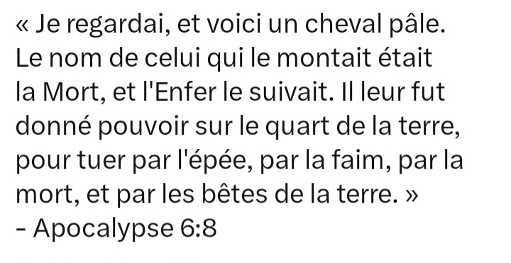 Je vous présente le 4e cavalier de l'Apocalypse, délaissant ses ailes et filant au galop vers Paris, suivi par les autres nations du monde. Tout un programme...satanique.