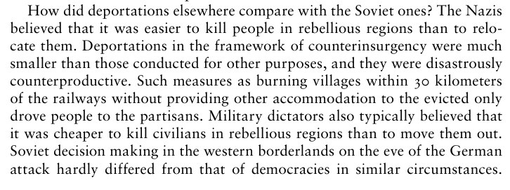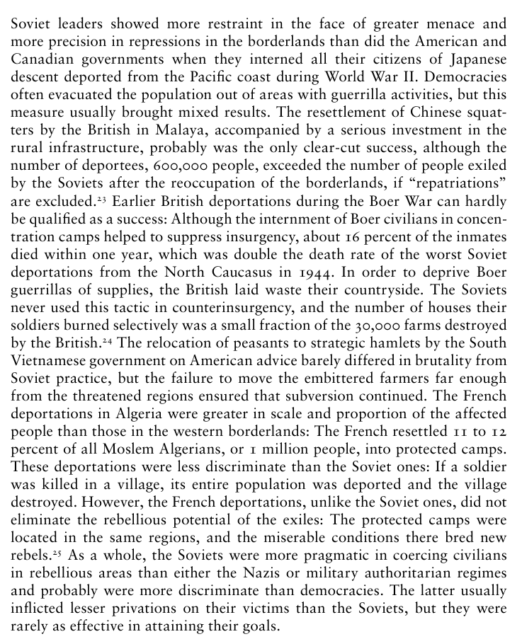 Soviet counterinsurgency was more discriminate in violence towards civilians than western regimes and of course hte Nazis. Comparison of Soviet counterinsurgency to much bloodier, less effective counterinsurgencies in Malaya, South Africa @MarkAmesExiled