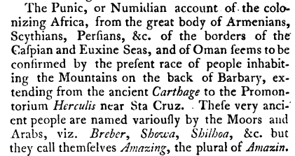 In a work written by Charles Vallancey, in the 18th century, well before the colonization of the Maghreb, we can read that "The Berbers refer to themselves by the name Amazigh."