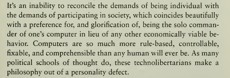 3/ Tech fascism in a nutshell: “Computers are so much more rule-based, controllable, fixable, and comprehensible than any human will ever be. As many political schools of thought do, these techno-libertarians make a philosophy out of a personality defect.“ She wrote this in 2000!