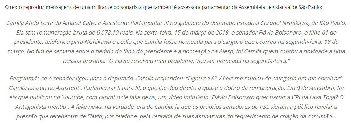 Vou deixar o link e print de matéria do Felipe Moura Brasil onde o Senador Flavio Bolsonaro ligou para deputado federal empregar ela em 2019. +🧶 crusoe.com.br/copy/exclusivo…