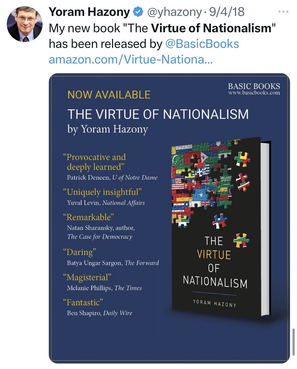 8/ The so-called “National Conservatism” Movement was kickstarted by Yoram Hazony with the publication of his book, the Virtue of Nationalism, in 2018.