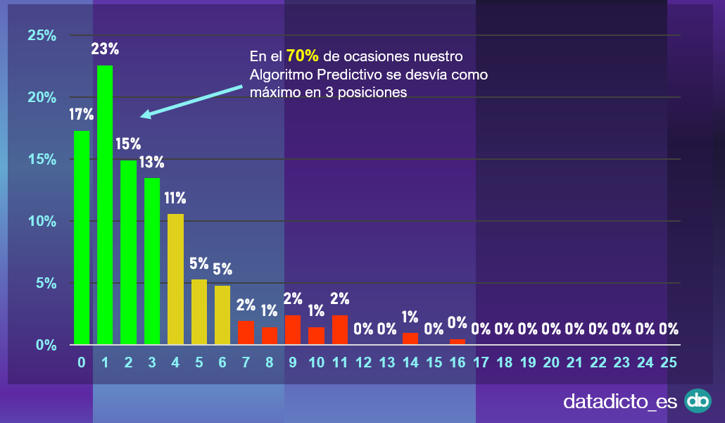 ✅¡En el 70% de ocasiones (años 2015-2023) nuestro algoritmo se equivoca como máximo en 3 posiciones.