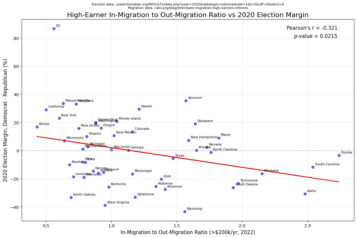 Ratio of in-migration to out-migration among high-earners vs 2020 presidential election margin. Unsurprisingly, productive people (Elite Human Capital, if you prefer), vote with their feet towards red states.