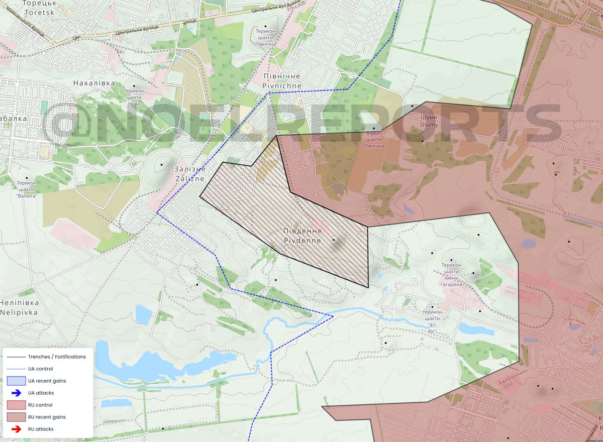 Toward Toretsk, Russians have moved deeper into Zalizhne, new footages shows. The salient east (Pivdenne/Terricon area) was previously held by Ukrainian forces, but is now contested. It is believed to be under Russian control, or at least under fire control. Needs confirmation.