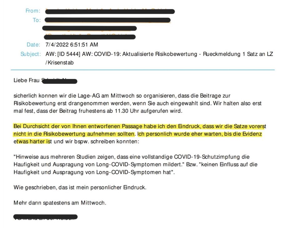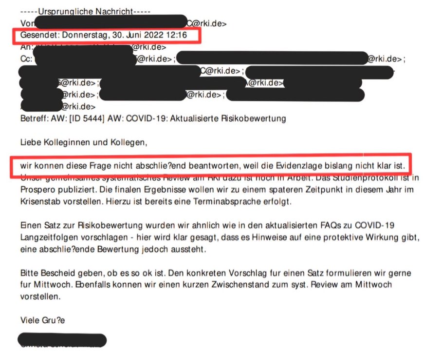 En résumé, les courriels divulgués indiquent qu'il n'y a eu à ce jour (juin/juillet 2022) AUCUNE EVIDENCE concernant un effet protecteur contre le Covid long grâce à la vaccination !
