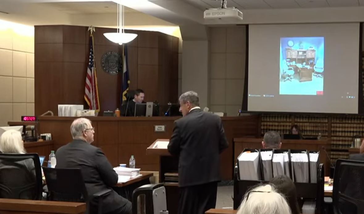 Cannon's next exhibit: Tina Peters desk. #TinaPeters looks on as her desk is shown in the courtroom.