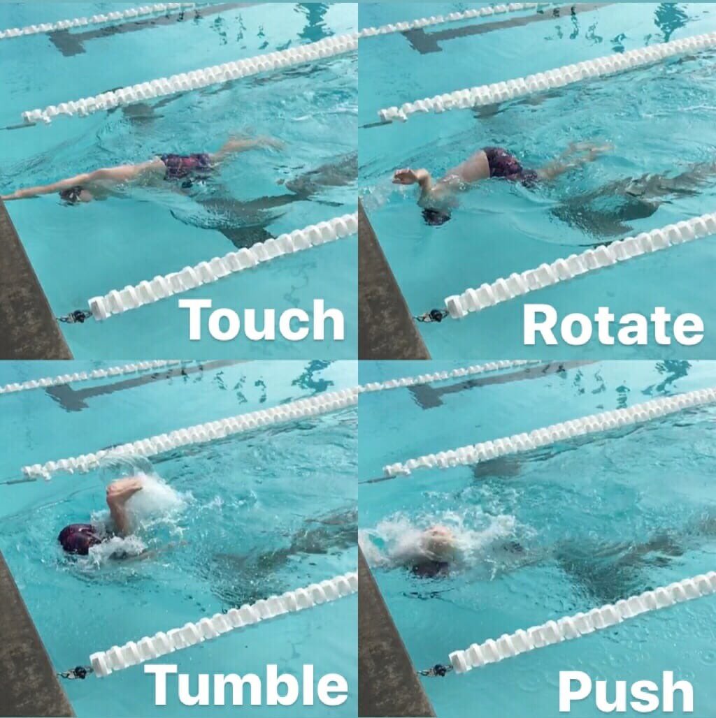 A la hora de los giros, la técnica que generalmente se usa es tocar con las manos la pared y girar las piernas por sobre la cabeza