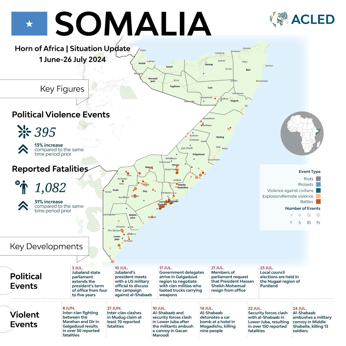 ACLED records 395 political violence events and 1,082 reported fatalities from 1 Jun to 26 Jul 2024. Most in the Lower Shabelle region.