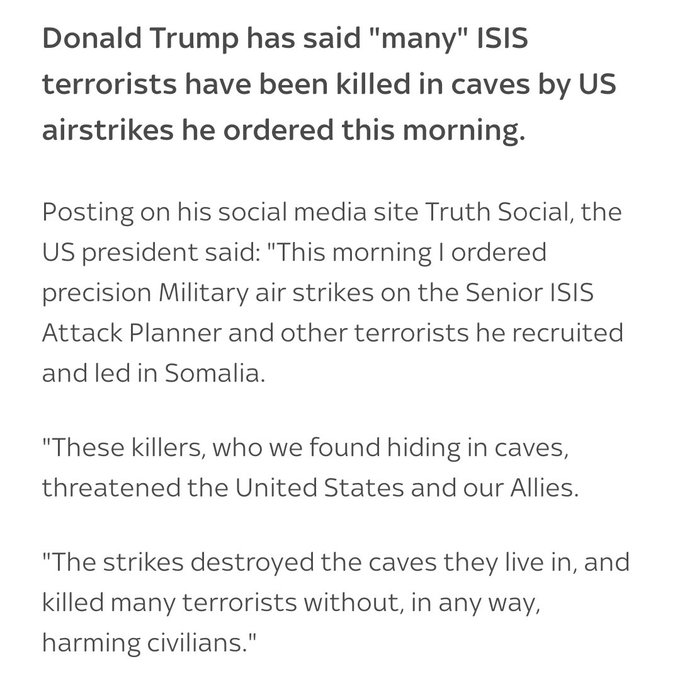 17) Trump says he “ordered precision military airstrikes” on a “senior ISIS attack planner & other terrorists” in Somalia.
