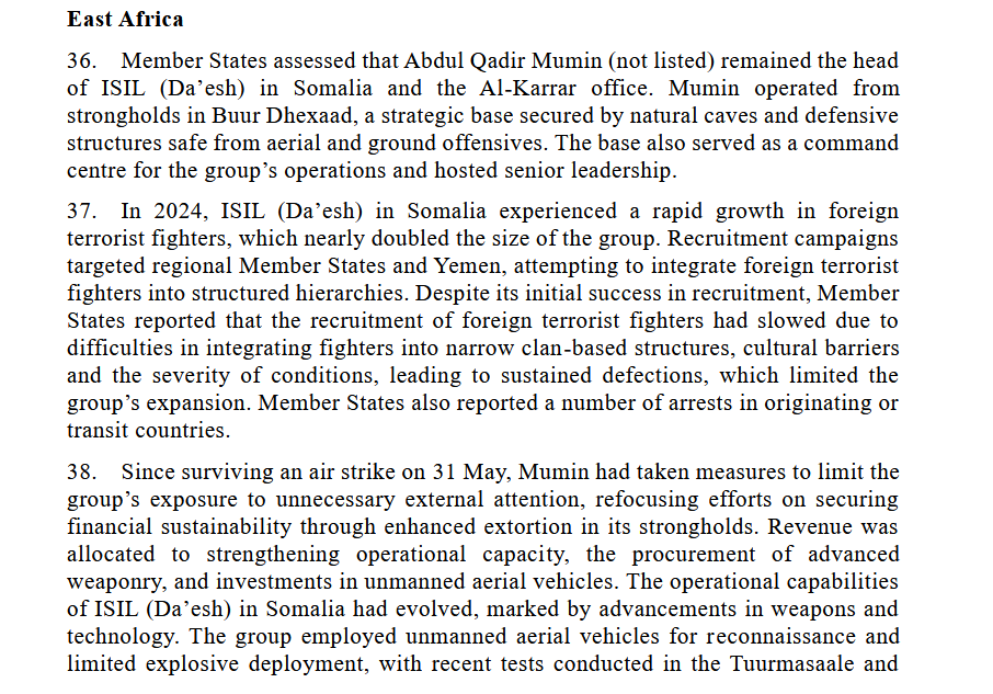 "On Sunday [Feb 17,2025], the Puntland Counter- Terrorism Command confirmed UAE- powered airstrikes Darar-Madoobe area in Cal-Miskaad, killing more than 12 terrorists, including senior members of ISIS."