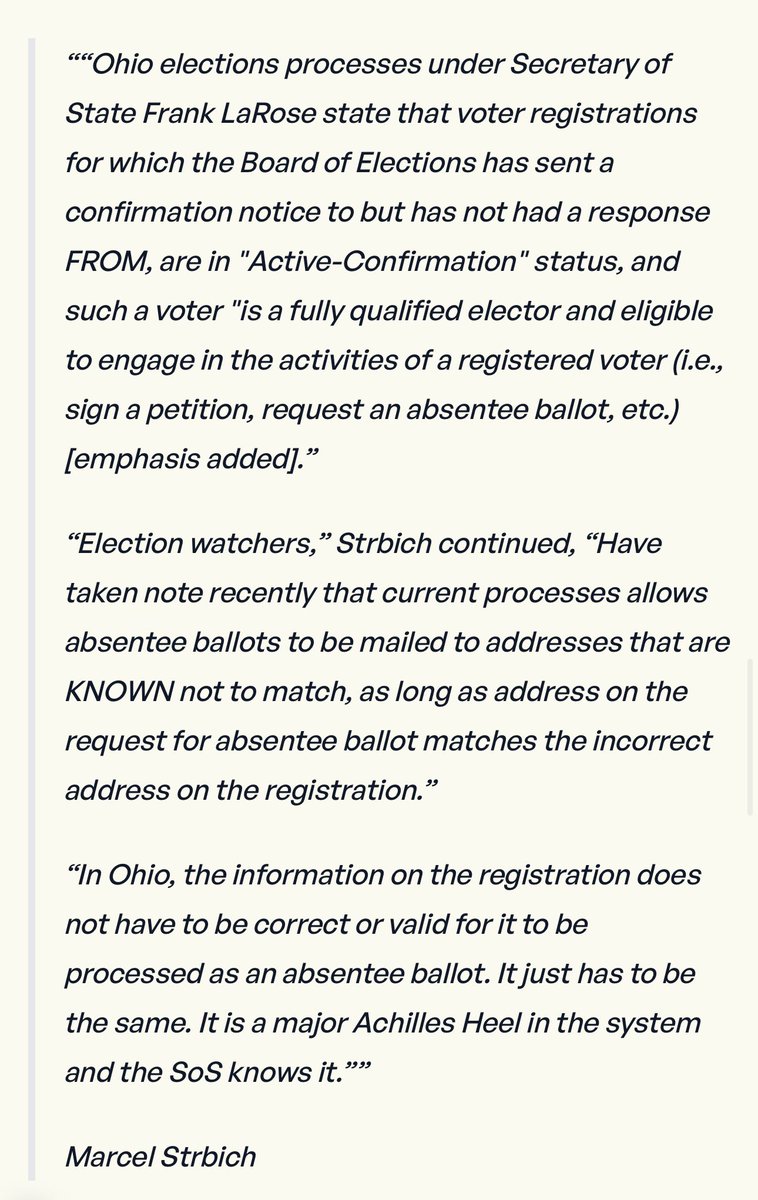 THREAD! 🚨🧵10. These types of submissions pose significant threats to a free and fair 2024 election, in part because of the way Ohio’s removes bogus records from the rolls. The process leaves a gaping hole in the election system, with the opportunity to use these fraudulent submissions as a way to submit fraudulent ballots. Nicolai stressed that organizations that harvest ballots fraudulently care more about the ballot than they do the vote. Strbich says it is a civil rights issue because it “disenfranchises voters” and nullifies valid votes.
