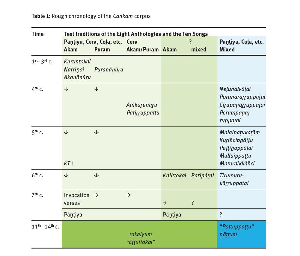 Indologist Eva Wilden has taken a more cautious approach. While She dates the Sangam corpus from 1st century AD to 9th century AD, stratifying the literature in several intermittent stages, she also concedes that there is no inscriptional evidence for the concept of 'sangam' before 9th century.