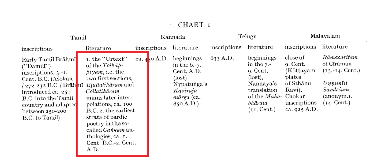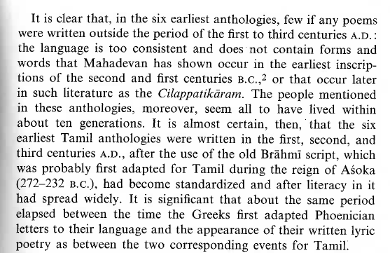 Scholar Linguist Kamil Zvelebil is considered an authority on this subject. He dates Tolkapiyyam back to 100 BC and earliest layers of Sangam poetry back to 1st century BC-2nd century AD. Further, he concedes a lot of later day interpolations.