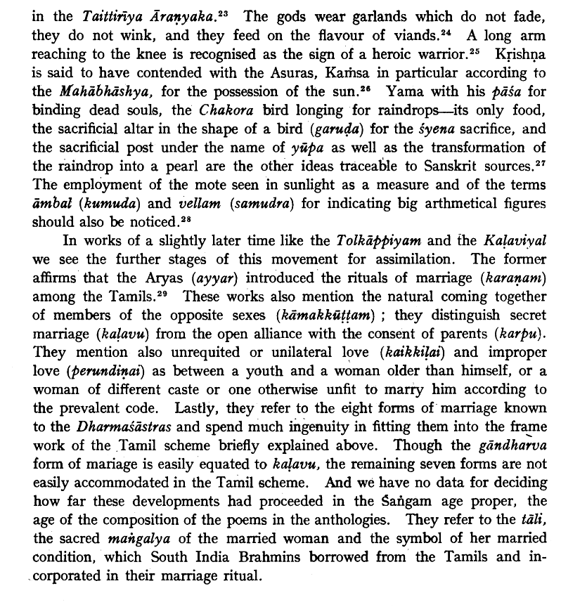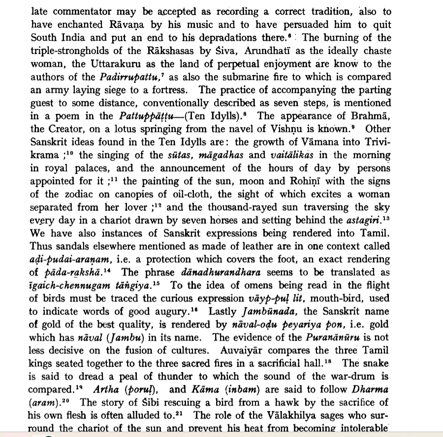 The Sangam kings claimed their ancestors fed the armies in Mahabharata war. Sangam poets made very frequent references to events of Sanskrit epics like burning of Khandava forest, skills of Bhima in cookery, Rama's council held under banyan tree in Dhanushkoti, the burning of Tripuras by Shiva, Arundhati as ideal chaste woman, Brahma spring from lotus navel of Vishnu, the story of Vamana, Uttarakuru as land of perpetual enjoyment, Shibi rescuing a bird by his own flesh, Krishna's battle with Kamsa, Yama with his Pasha etc