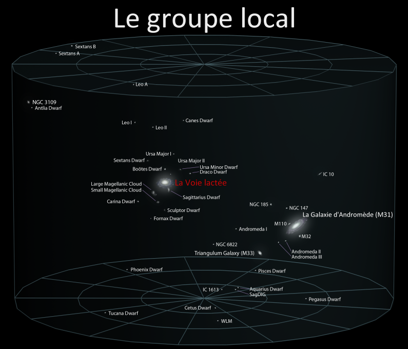 Le Groupe Local est constitué de La Voie Lactée, Andromède et leurs satellites : M33, M101 et le Grand Nuage de Magellan pour les principaux.