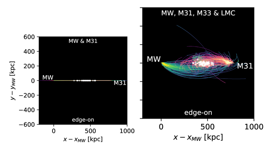 Les nouvelles simulations informatiques montrent que le destin du système Voie Lactée (MW)/ Andromède (M31)/ Triangle (M33) / Grand Nuage de Magellan (LMC) est incertain.