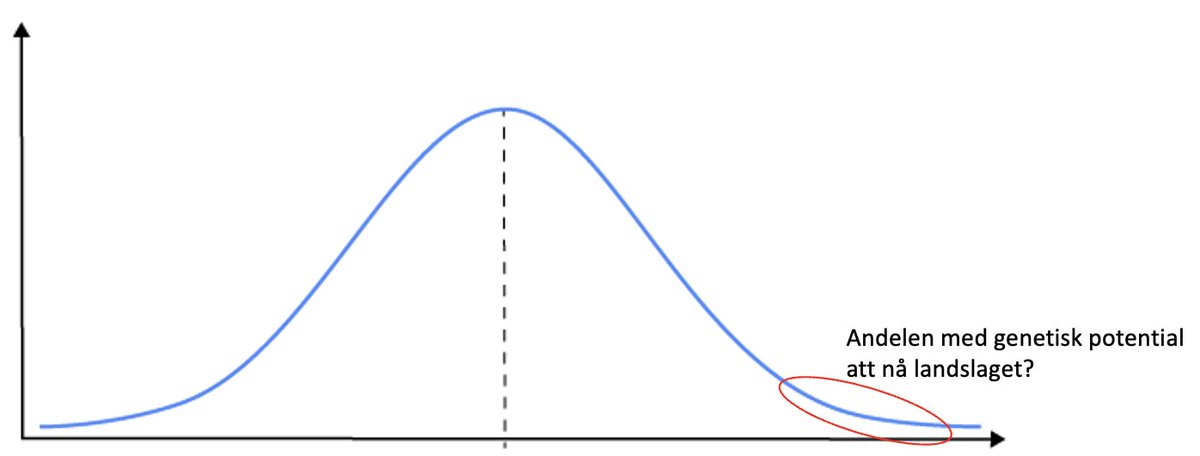 En sak som sällan diskuteras men som är ett faktum är att alla inte har den genetiska potentialen att bli landslagsspelare. Genetiken påverkar både våra fysiska och psykiska förutsättningar. Hur stor andel av befolkningen som rent genetiskt skulle kunna nå hela vägen är omöjligt att veta, men om vi tittar på figuren nedan så gäller det sannolikt endast svansen på normalfördelningskurvan.