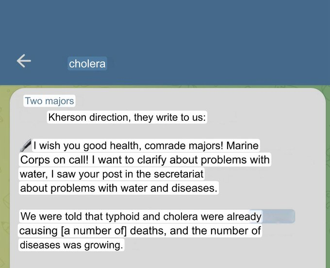 Russian telegram channels reported RuAF cholera & typhoid outbreak in Kherson in late June 2024.