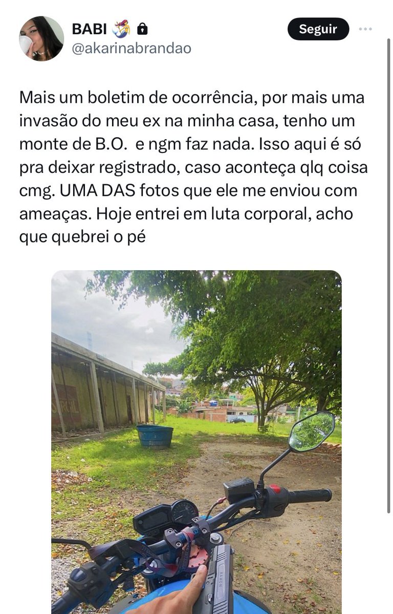 Pra quem não entendeu: essa moça fez um post reclamando que está sendo ameaçada pelo ex-namorado. Porém, aconteceu um imprevisto: ela esqueceu de apagar os tweets antigos em que dizia que gostava de amor bandido