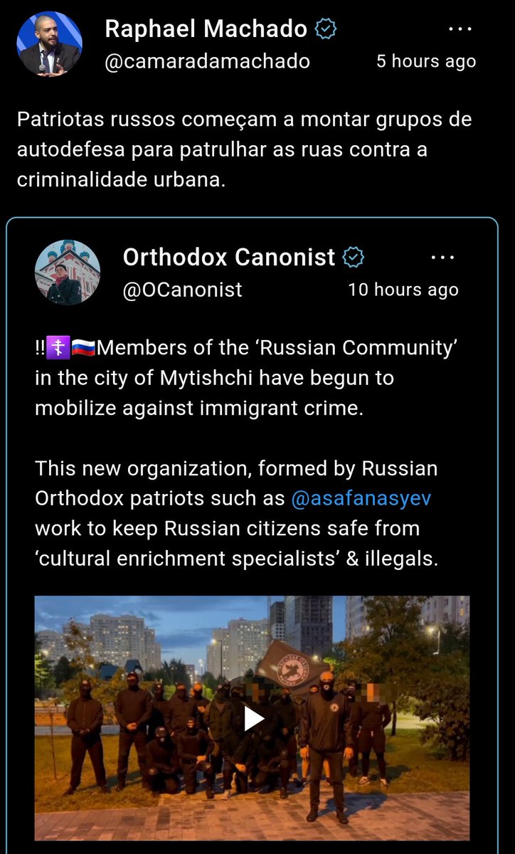 🧵neofascista de q haveria um "genocídio branco" com a chegada de imigrantes. Para isso, se fantasiam, ao estilo do grupo grego neonazi Aurora Dourada, de movimento social. Criaram um aplicativo com uma função "SOS", onde cidadãos certificados como representantes do mundo russo +