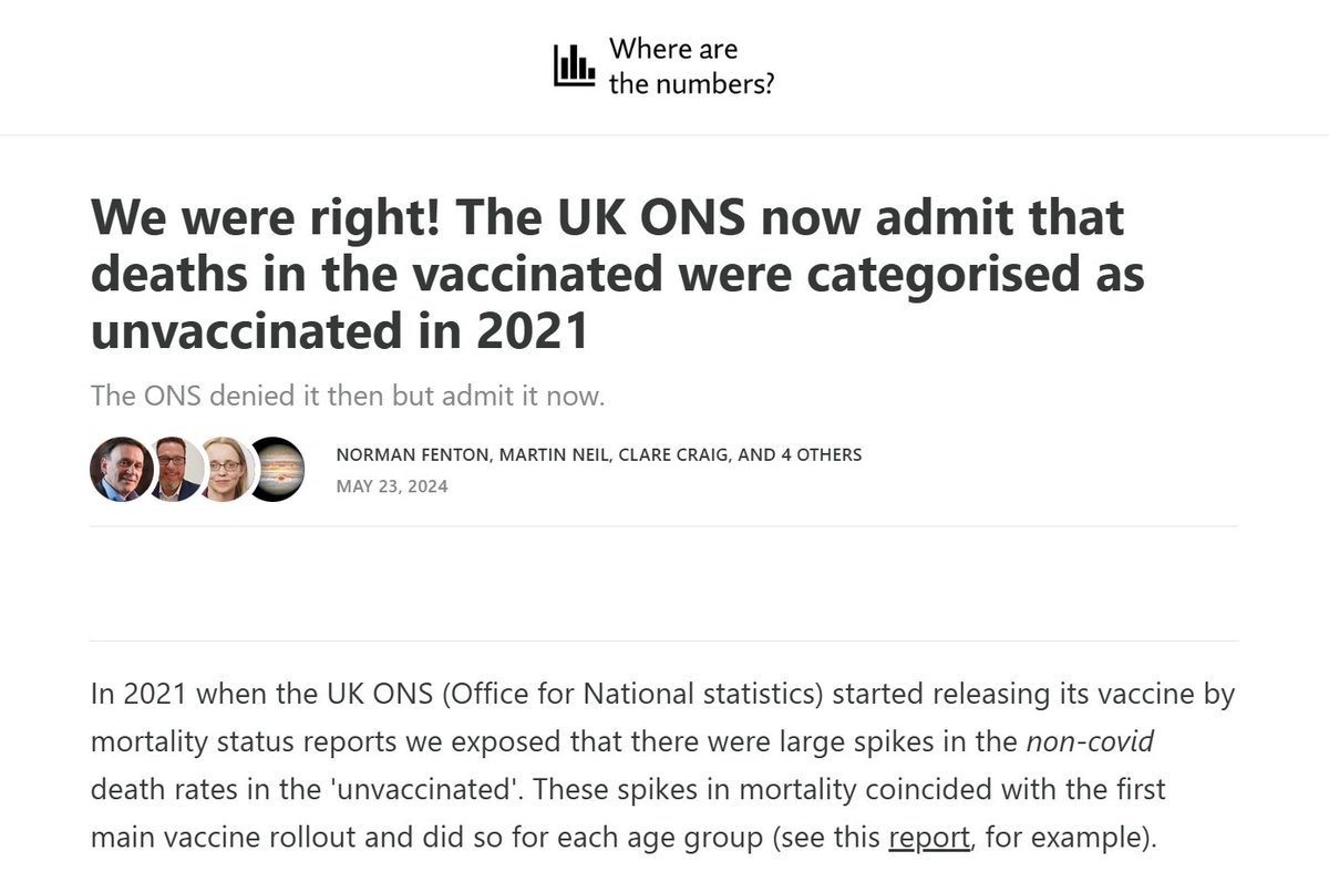 'Olimme oikeassa! Yhdistyneen kuningaskunnan ONS myöntÀÀ nyt, ettÀ rokotettujen kuolemantapaukset luokiteltiin rokottamattomiksi vuonna 2021 - ONS kiisti sen silloin, mutta myöntÀÀ sen nyt'