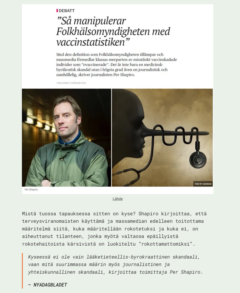 "Vuonna 2021, kun Yhdistyneen kuningaskunnan ONS (Office for National Statistics) alkoi julkaista rokotuksiin perustuvia kuolleisuusraporttejaan, havaitsimme, ettÀ rokottamattomien kuolleisuusluvuissa oli suuria piikkejÀ. NÀmÀ kuolleisuuspiikit osuivat samaan aikaan kuin rokotteen ensimmÀinen pÀÀasiallista kÀyttöönottoa koskeva vaihe, ja ne osuivat samaan aikaan jokaisessa ikÀryhmÀssÀ. ..