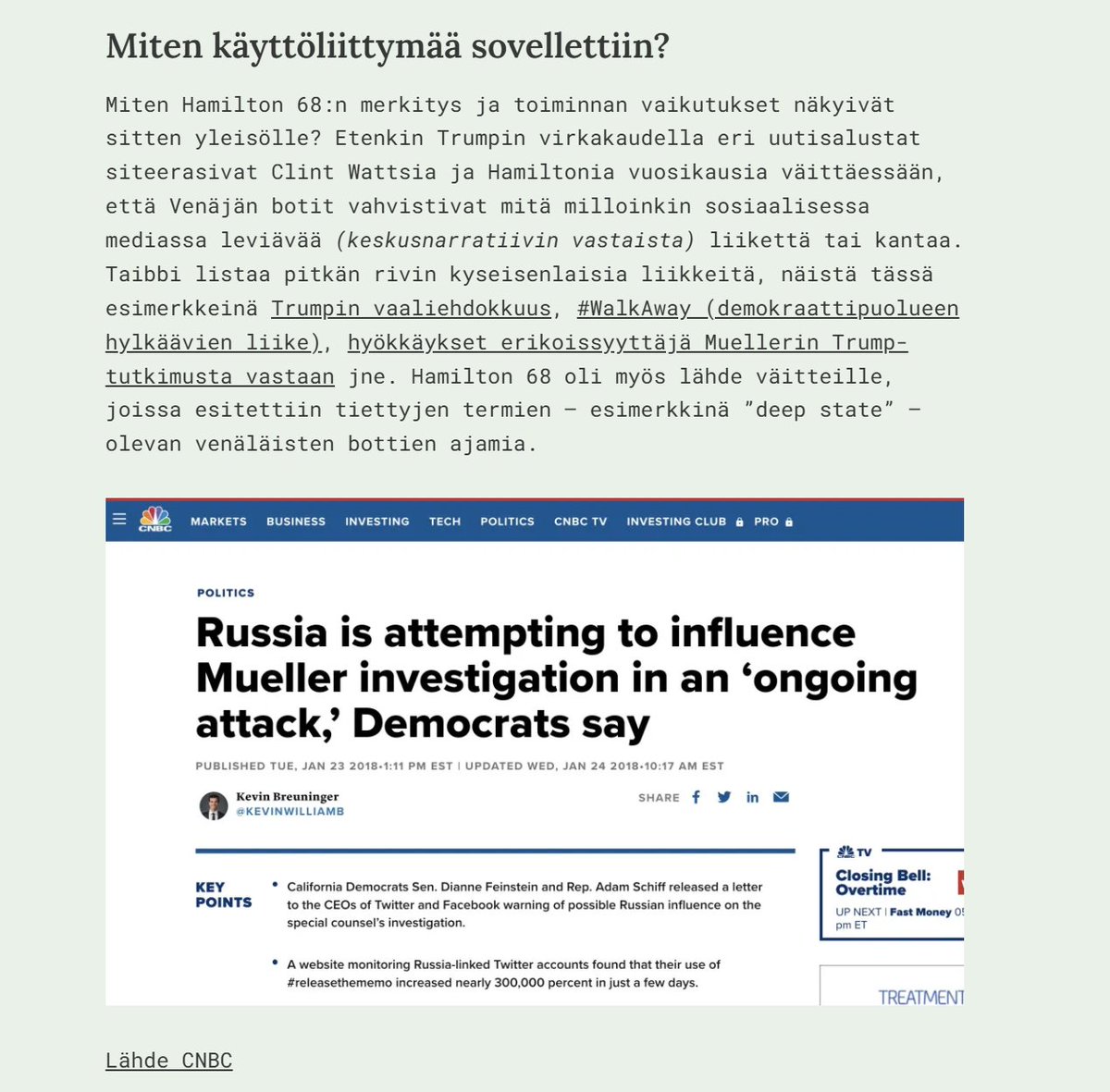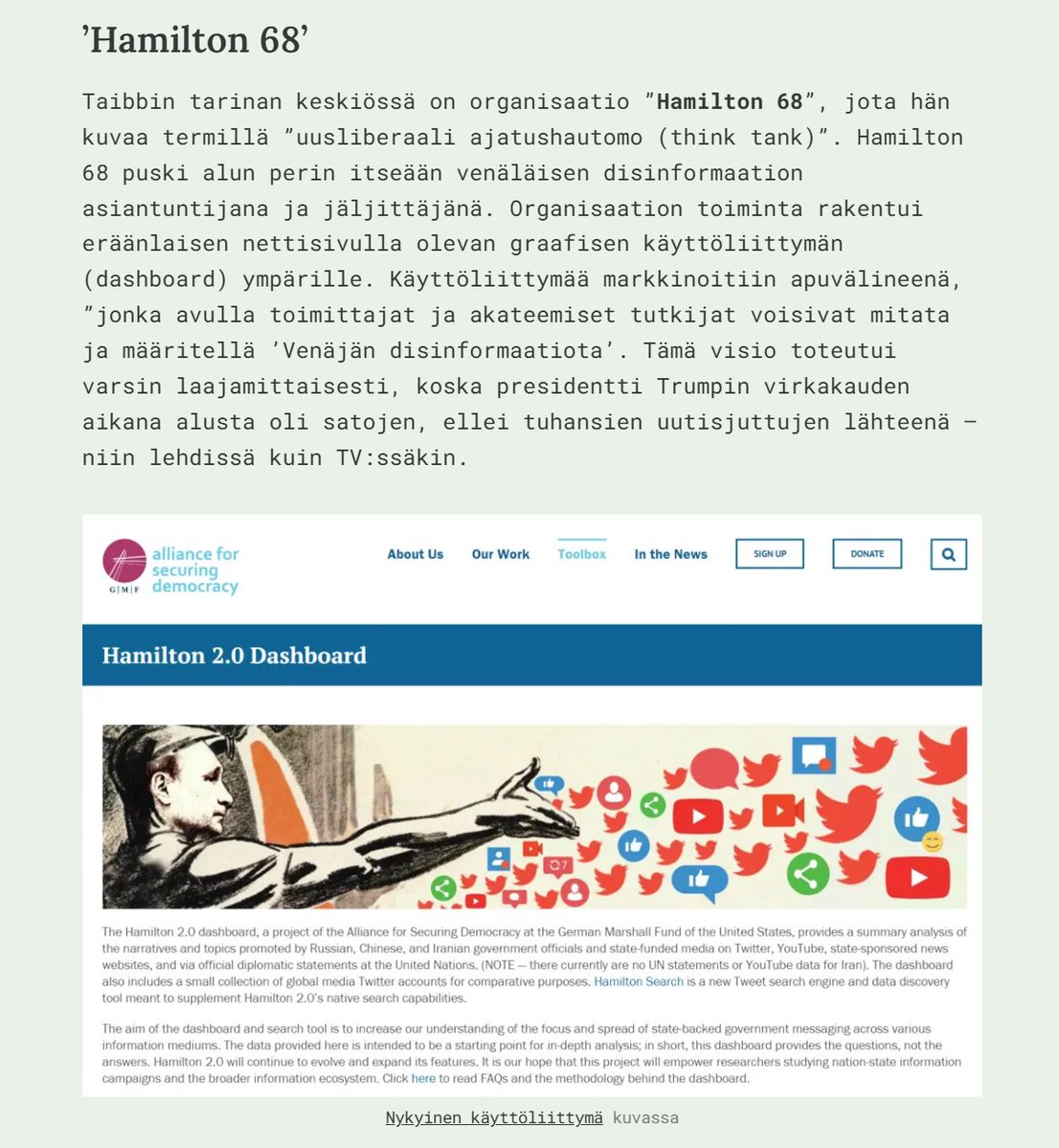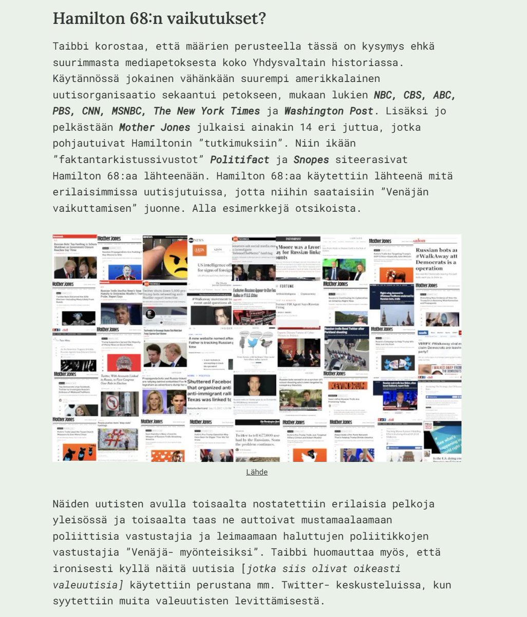 LisÀksi artikkelisarjan monesta eri artikkelista kÀy nÀkyvÀsti ilmi se, millaisin resurssein narratiivia on ohjailtu (esim. Trump- aiheinen uutisointi, joka kaikunut myös meillÀ)