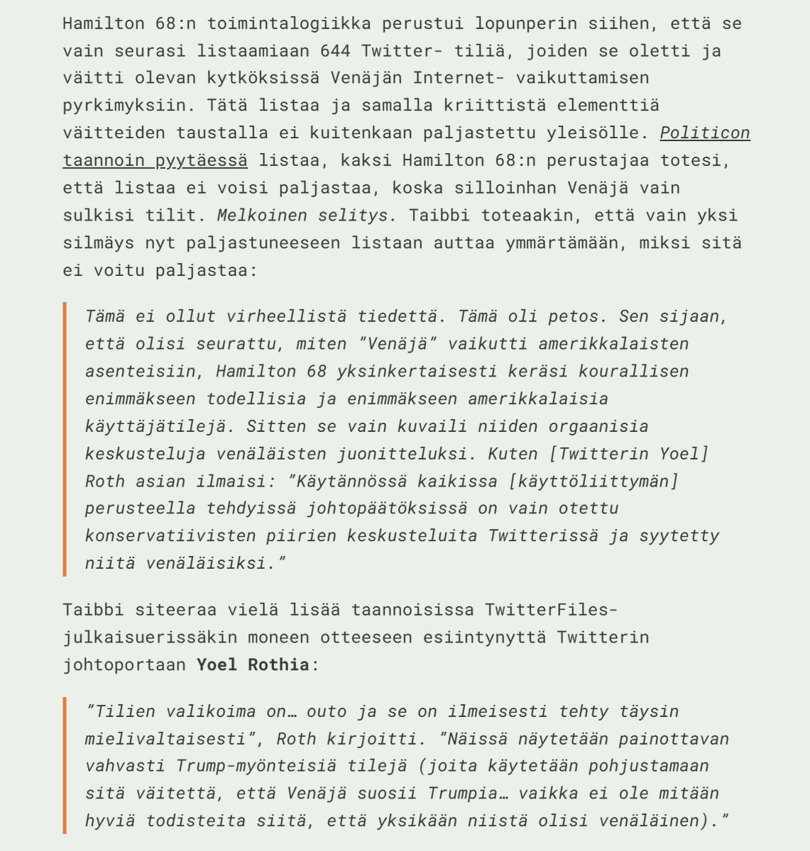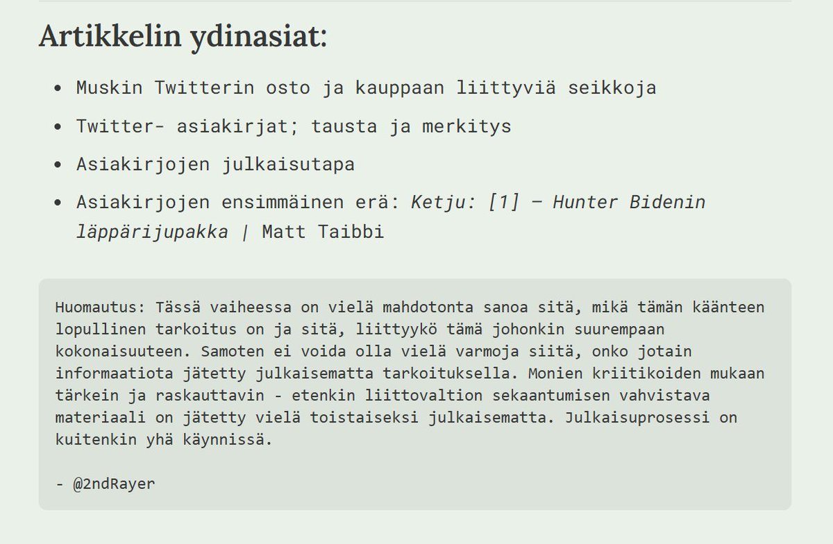 MitÀ lopulta on "tuotu ulkomailta"? Oheisen keskustelun nÀhtyÀni pÀÀtin kaluta "Twitter Files" -koosteeni ja nostaa esiin kohtia, joissa kyseistÀ aihetta sivutaan.