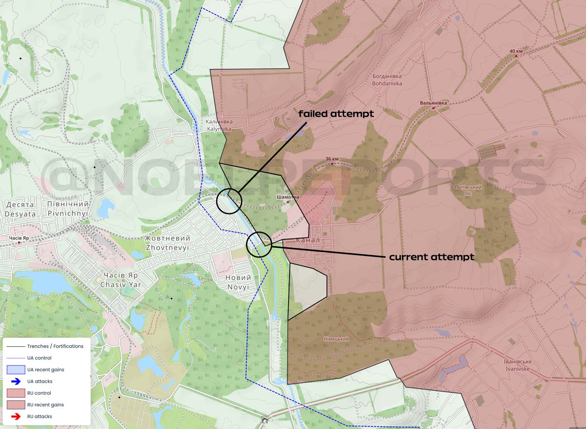 After initially grabbing a foothold in the Zhovtnevyi district, Russians were pushed back over the canal. Now, Russians are attempting to push into the same district over the bridge a bit more south, until now unsuccesful. Fighting is very difficult.