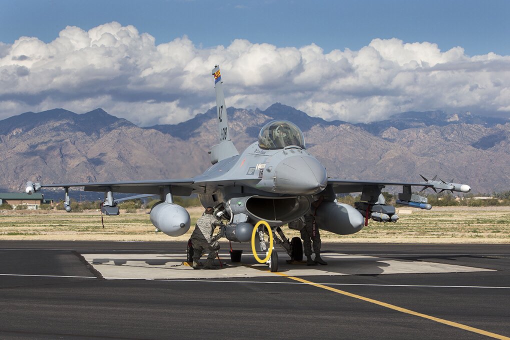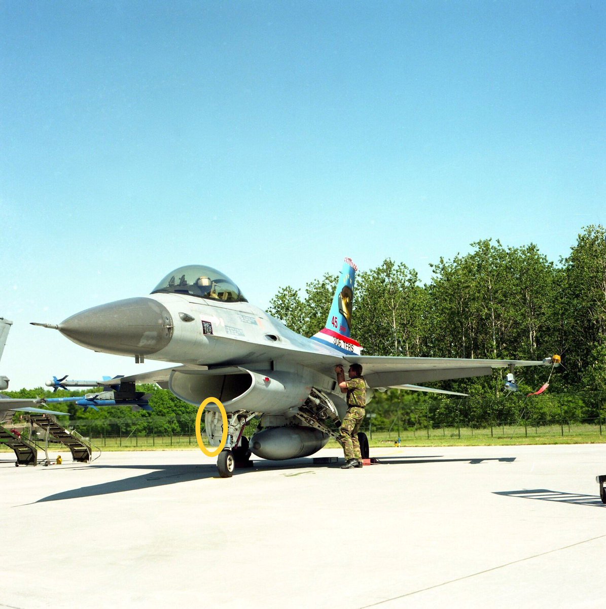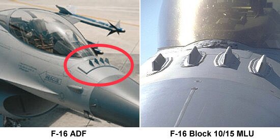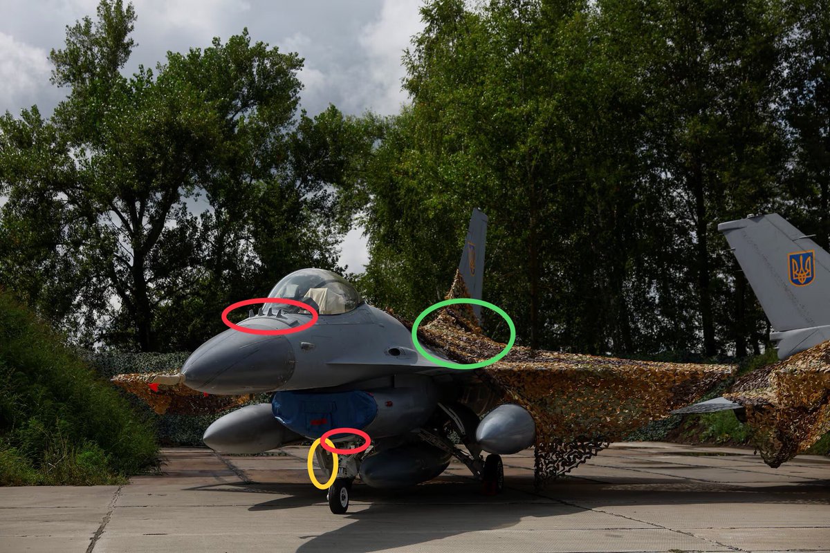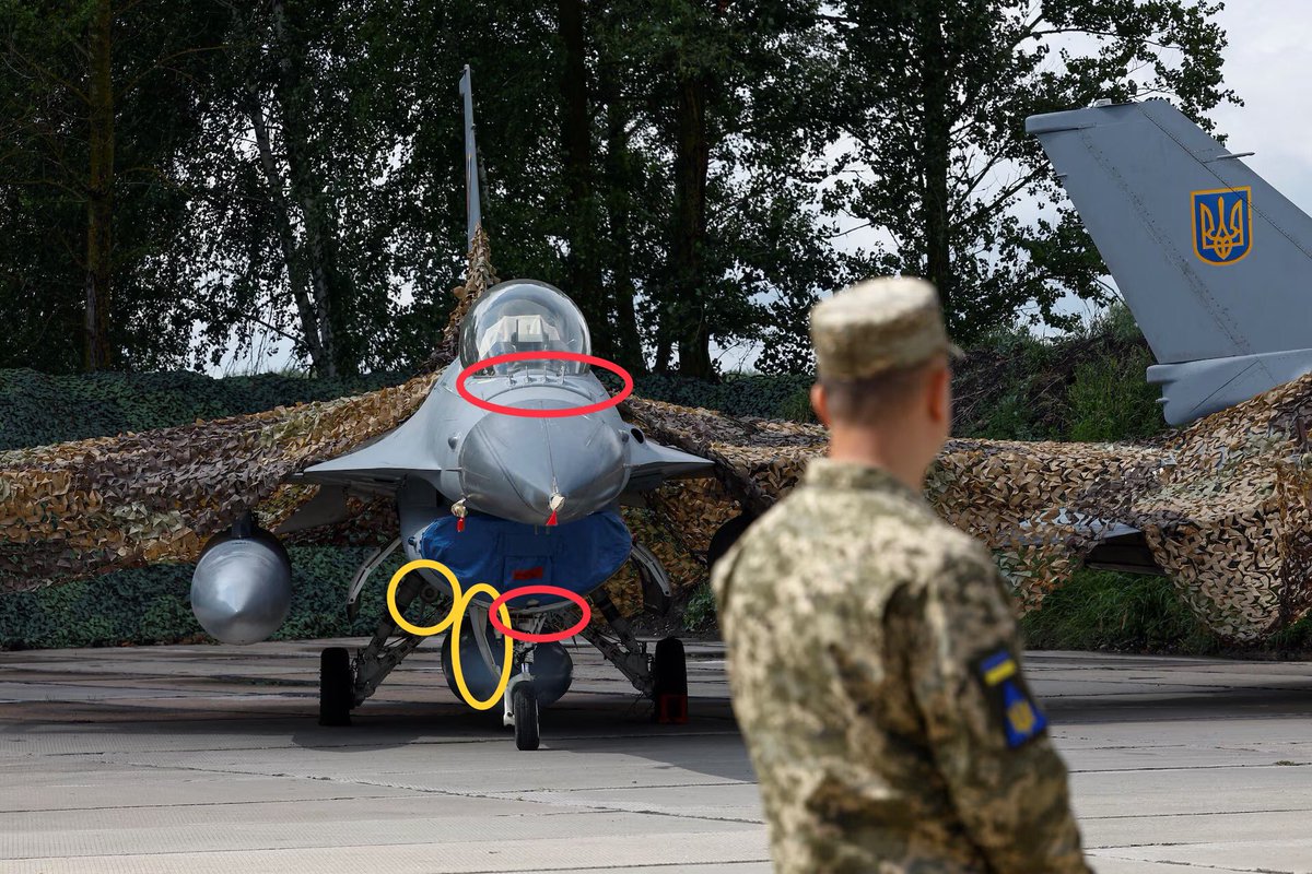 The jets on the ground have the same IFF antennae as those found on the F-16ADF, the AN/APX-109 (circled red). The ADF also has a bulge in the tail, covered by the camouflage netting on the Ukrainian jet (green). This aircraft also features the pre-MLU upgrade landing lights.