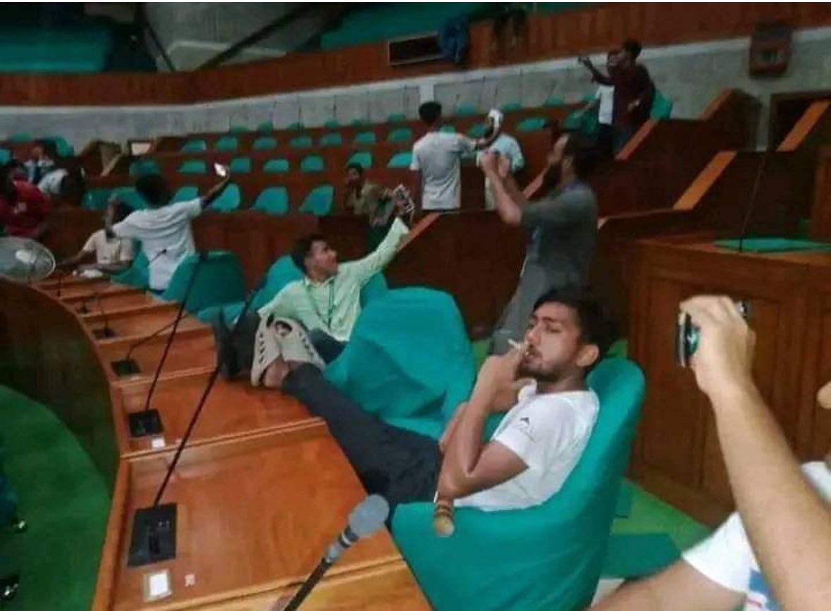 @AlexSantosRold1 🇧🇩 Momento en que los manifestantes han entrado al parlamento de Bangladés.