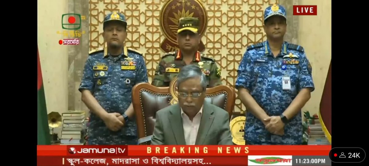 🇧🇩 El presidente Mohammed Shahabuddin, junto a los militares, anunció en un discurso televisado que el gobierno provisional que se forme en consulta con los partidos políticos y las partes interesadas organizará elecciones lo antes posible, el parlamento queda disuelto.