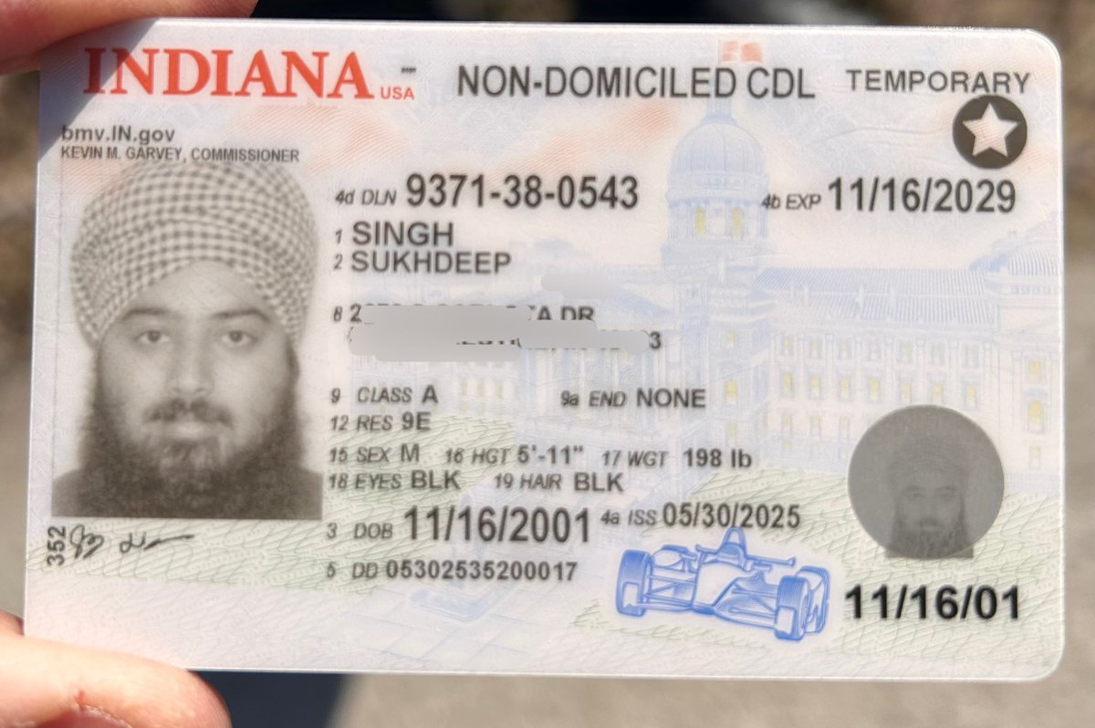 While local police have not yet identified him, federal sources tell @FoxNews his name is Singh Sukhdeep, and he received his CDL from the red state of Indiana in May 2025. Photo of the license is provided via federal source. (I have redacted his address).