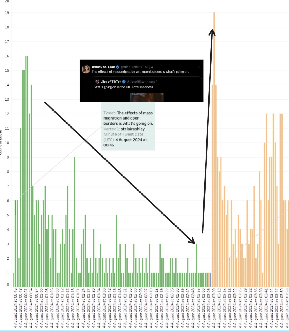2/ On Aug 4 at 00.45 UTC the account @stclairashley retweeted a @libsoftiktok video with a false and xenophobic remark about immigration - attributing violence in UK to open borders (there aren't open borders). Musk replies at 03.07 UTC saying "Civil war is inevitable"