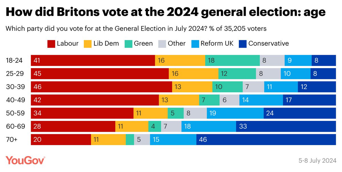 Age continues to be a key factor in how Britons vote, with younger adults mostly backing left wing parties and older adults tending to vote for right wing parties.