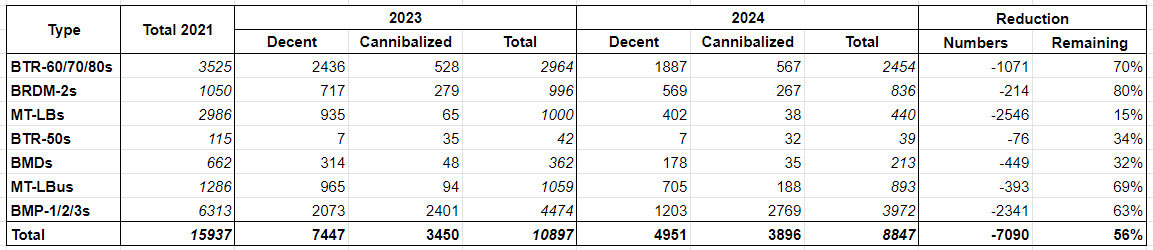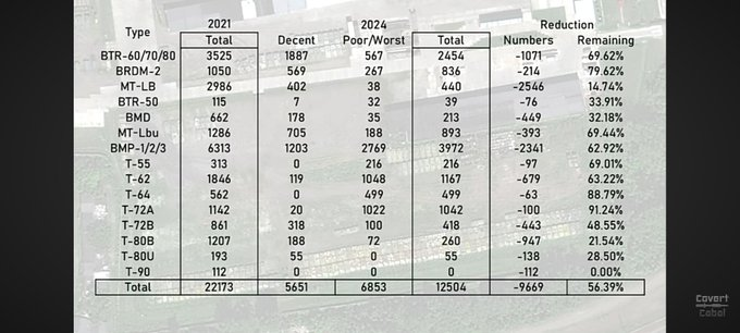 2/ First of all, here are the overall numbers of stored Russian APCs and IFVs, and also a comparison with the tally in early 2024. As you can see, over half of the prewar amount remains, and over a thousand have been pulled out from storage since this year began.