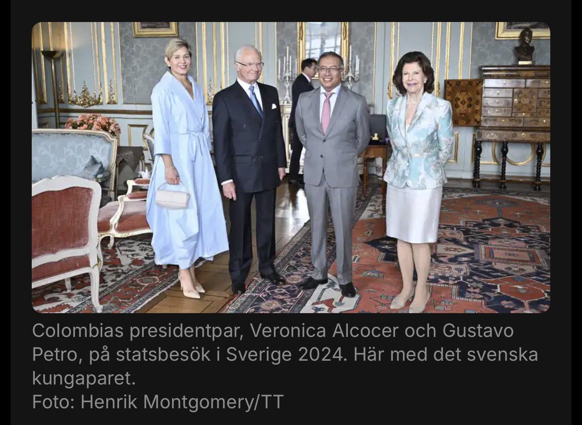 La pareja presidencial de Colombia, Verónica Alcocer y Gustavo Petro, durante una visita de Estado a Suecia en 2024. Aquí con la pareja real sueca.
