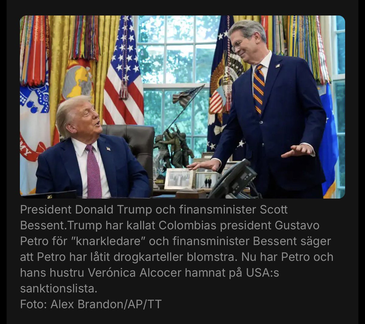 “Está inundando EE.UU. y envenenando a los estadounidenses. El presidente Petro ha permitido que los carteles de droga prosperen y se ha negado a detener esta actividad”, dice el secretario del Tesoro estadounidense, Scott Bessent, en un comunicado.