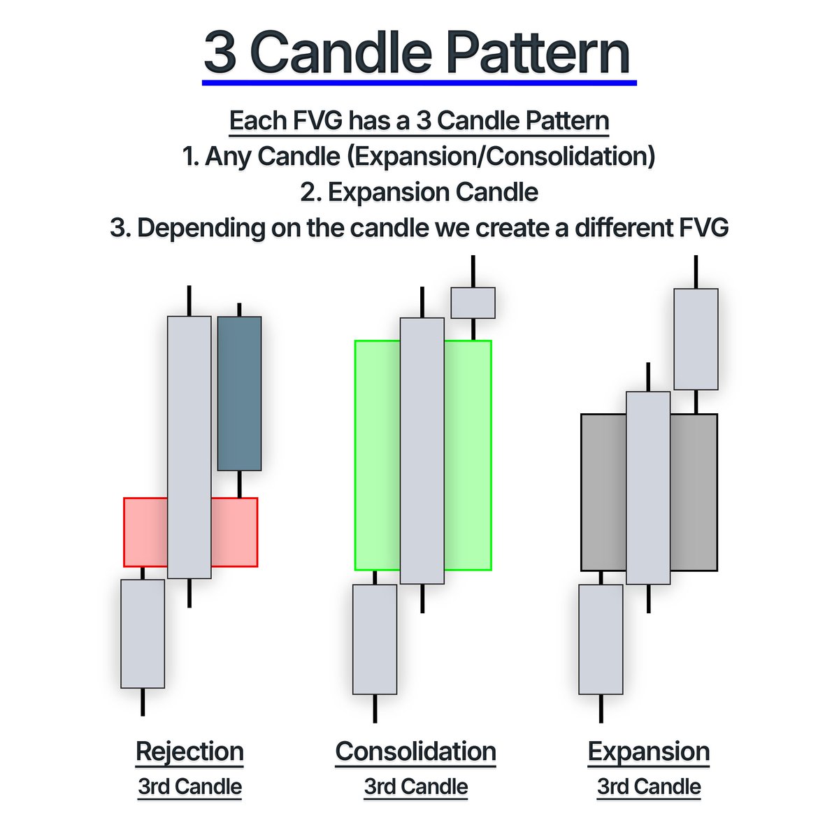 FVGs have a 3 Candle Pattern. The 3rd candle dictates what type of FVG we have.